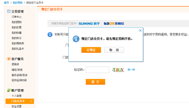 2.易购账号有绑定手机,填写门店会员卡号、门店会员卡密码和图片验证码,点击提交按钮。